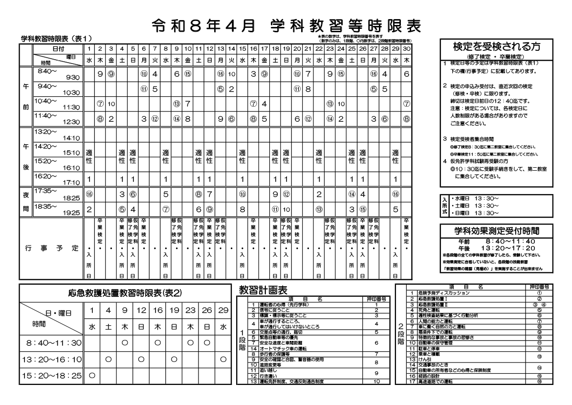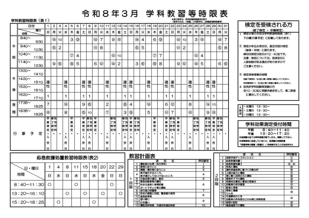 学科時間割表 TOP > 在校生の方向け > 学科時間割表 学科時限表を公開しています。技能教習の予定を考慮しながら、効率よく受講していきましょう。 令和8年3月 学科時間割 時限表をクリックすると、拡大画像が表示されます。プリントする場合は、下部の「プリント用を開く」をクリックしてください。 プリント用を開く(PDF:235 KB) 令和8年4月 学科時間割 時限表をクリックすると、拡大画像が表示されます。プリントする場合は、下部の「プリント用を開く」をクリックしてください。 プリント用を開く(PDF:235 KB)